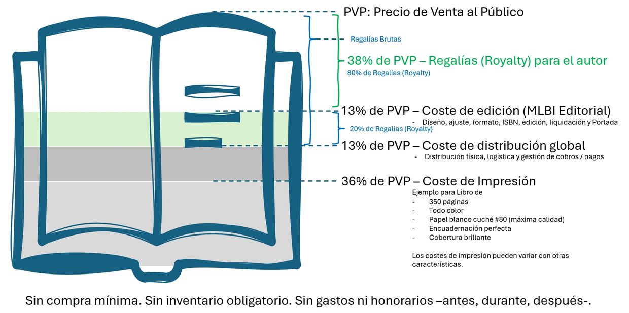 Aquí es donde el modelo de MLBI difiere con respecto a las demás. Su estructura garantiza al autor un 38% del PVP (o un 80% de royalties / regalías).